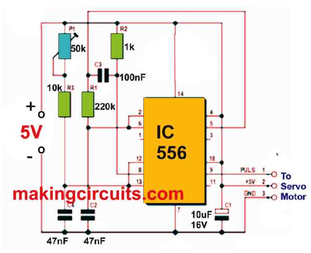 此外,導線上的信號經過脈沖寬度調制(PWM)并由接收器傳輸。長度為1ms的正脈沖伺服臂從其行程的一端完全啟動。如果使用2毫秒的脈沖,則手臂完全朝相反方向移動。這些限制之間的脈沖寬度(PWM)將臂驅動到與脈沖寬度成比例的中間位置。1.5毫秒的脈沖寬度使手臂居中,脈沖重復率接近20毫秒或約50 Hz。然而,這并不重要。如果懷疑該型號工作不正常,則遙控發射器、接收器或伺服電機可能有問題。這是靈活的伺服電機測試儀電路允許您快速檢查伺服并從診斷步驟中刪除任何非因素。此外,圖1所示的脈沖發生器設計是電子愛好者最常見的類型。